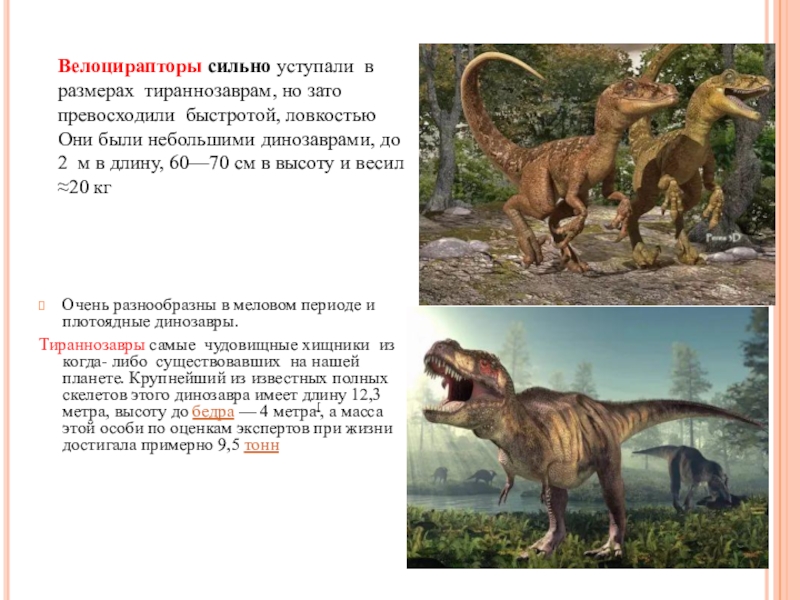 Тираннозавры самые чудовищные хищники из когда- либо существовавших на нашей планете. Крупнейший из известных полных скелетов этого динозавра имеет длину 12,3 метра, высоту до бедра — 4 метра[, а масса этой особи по оценкам экспертов при жизни достигала примерно 9,5 тонн