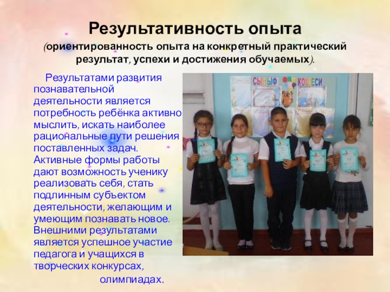 Результатами развития познавательной деятельности является потребность ребёнка активно мыслить, искать наиболее рациональные пути решения поставленных задач. Активные формы работы дают возможность ученику реализовать себя, стать подлинным субъектом деятельности, желающим и умеющим познавать новое. Внешними результатами является успешное участие педагога и учащихся в творческих конкурсах,