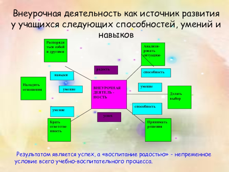 Результатом является успех, а «воспитание радостью» - непременное условие всего учебно-воспитательного процесса.