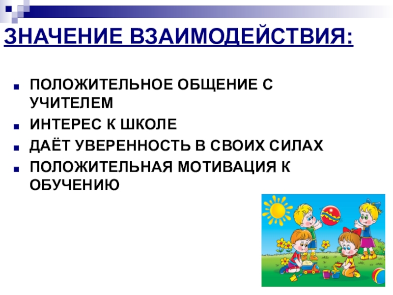 ЗНАЧЕНИЕ ВЗАИМОДЕЙСТВИЯ: ПОЛОЖИТЕЛЬНОЕ ОБЩЕНИЕ С УЧИТЕЛЕМИНТЕРЕС К ШКОЛЕДАЁТ УВЕРЕННОСТЬ В СВОИХ СИЛАХПОЛОЖИТЕЛЬНАЯ МОТИВАЦИЯ К ОБУЧЕНИЮ