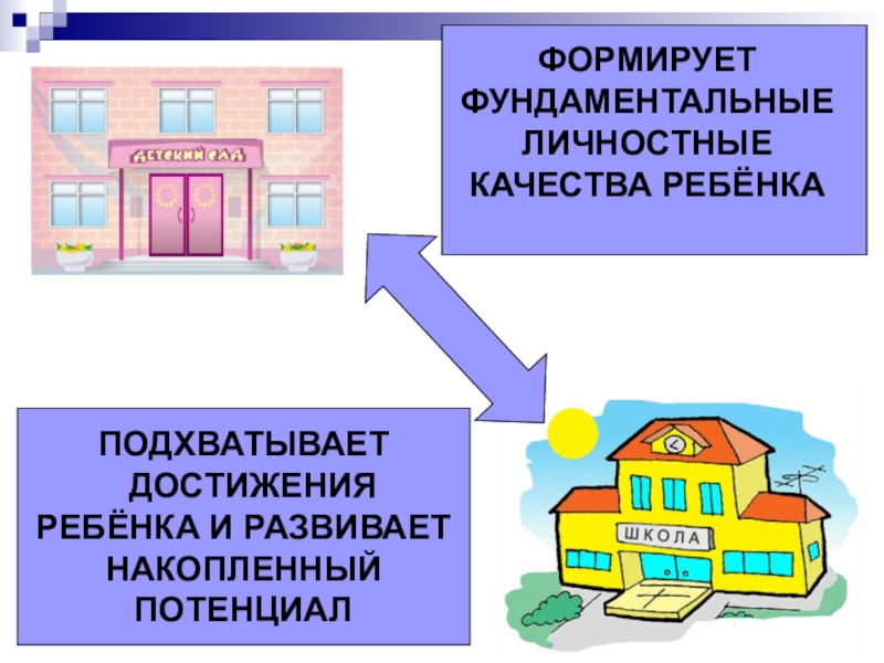 ПОДХВАТЫВАЕТ ДОСТИЖЕНИЯ РЕБЁНКА И РАЗВИВАЕТ НАКОПЛЕННЫЙ ПОТЕНЦИАЛФОРМИРУЕТ ФУНДАМЕНТАЛЬНЫЕ ЛИЧНОСТНЫЕ КАЧЕСТВА РЕБЁНКА