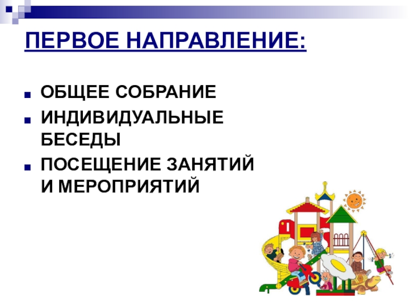 ПЕРВОЕ НАПРАВЛЕНИЕ:ОБЩЕЕ СОБРАНИЕИНДИВИДУАЛЬНЫЕ БЕСЕДЫПОСЕЩЕНИЕ ЗАНЯТИЙ И МЕРОПРИЯТИЙ