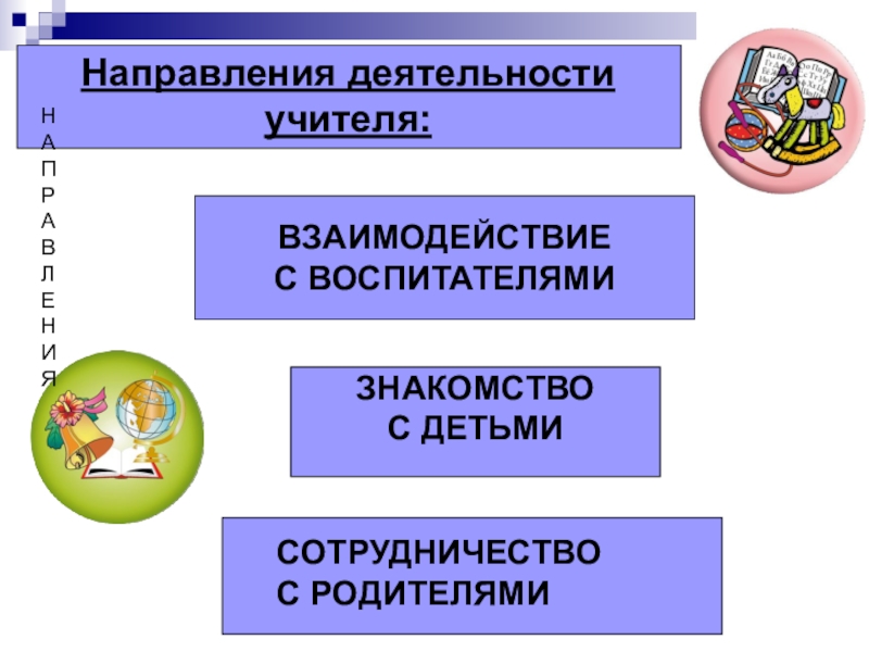 ЗНАКОМСТВО С ДЕТЬМИ ВЗАИМОДЕЙСТВИЕ С ВОСПИТАТЕЛЯМИСОТРУДНИЧЕСТВО С РОДИТЕЛЯМИНАПРАВЛЕНИЯНаправления деятельности учителя: