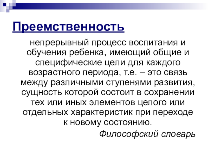 Преемственность  непрерывный процесс воспитания и обучения ребенка, имеющий общие и специфические цели для каждого возрастного периода,