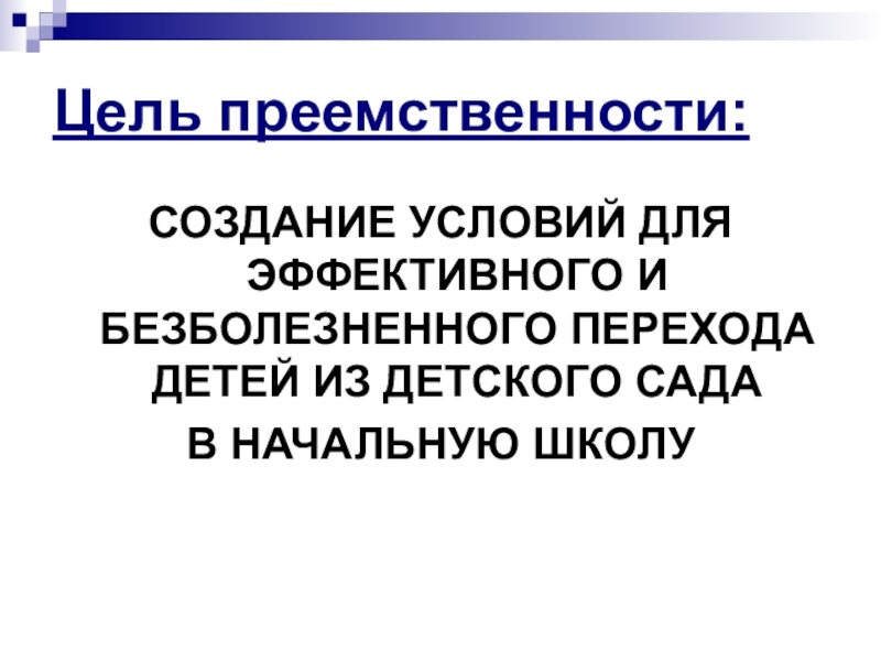 Цель преемственности:СОЗДАНИЕ УСЛОВИЙ ДЛЯ ЭФФЕКТИВНОГО И БЕЗБОЛЕЗНЕННОГО ПЕРЕХОДА ДЕТЕЙ ИЗ ДЕТСКОГО САДА В НАЧАЛЬНУЮ ШКОЛУ