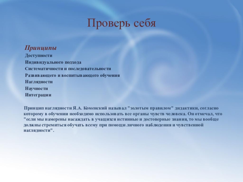 Принцип наглядности Я.А. Коменский называл "золотым правилом" дидактики, согласно которому в обучении необходимо использовать все органы чувств человека. Он отмечал, что "если мы намерены насаждать в учащихся истинные и достоверные знания, то мы вообще должны стремиться обучать всему при помощи личного наблюдения и чувственной наглядности".