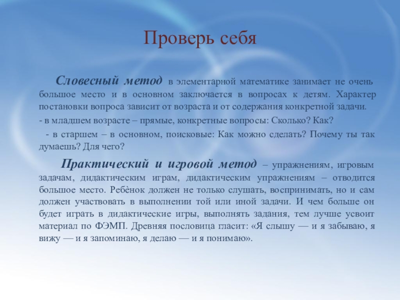 Практический и игровой метод – упражнениям, игровым задачам, дидактическим играм, дидактическим упражнениям – отводится большое место. Ребѐнок должен не только слушать, воспринимать, но и сам должен участвовать в выполнении той или иной задачи. И чем больше он будет играть в дидактические игры, выполнять задания, тем лучше усвоит материал по ФЭМП. Древняя пословица гласит: «Я слышу — и я забываю, я вижу — и я запоминаю, я делаю — и я понимаю».