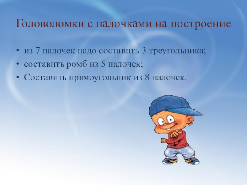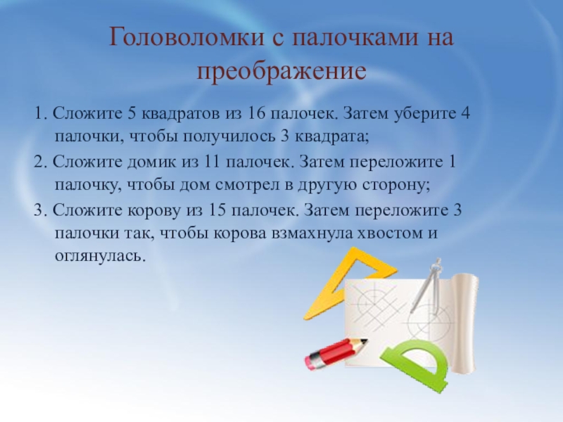 3. Сложите корову из 15 палочек. Затем переложите 3 палочки так, чтобы корова взмахнула хвостом и оглянулась.