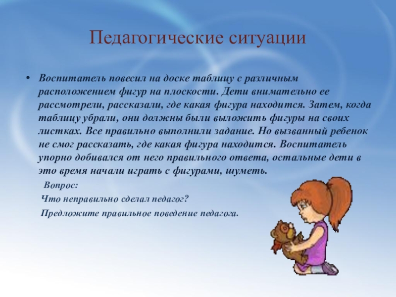 плоскости. Дети внимательно ее рассмотрели, рассказали, где какая фигура находится. Затем, когда таблицу убрали, они должны были выложить фигуры на своих листках. Все правильно выполнили задание. Но вызванный ребенок не смог рассказать, где какая фигура находится. Воспитатель упорно добивался от него правильного ответа, остальные дети в это время начали играть с фигурами, шуметь.