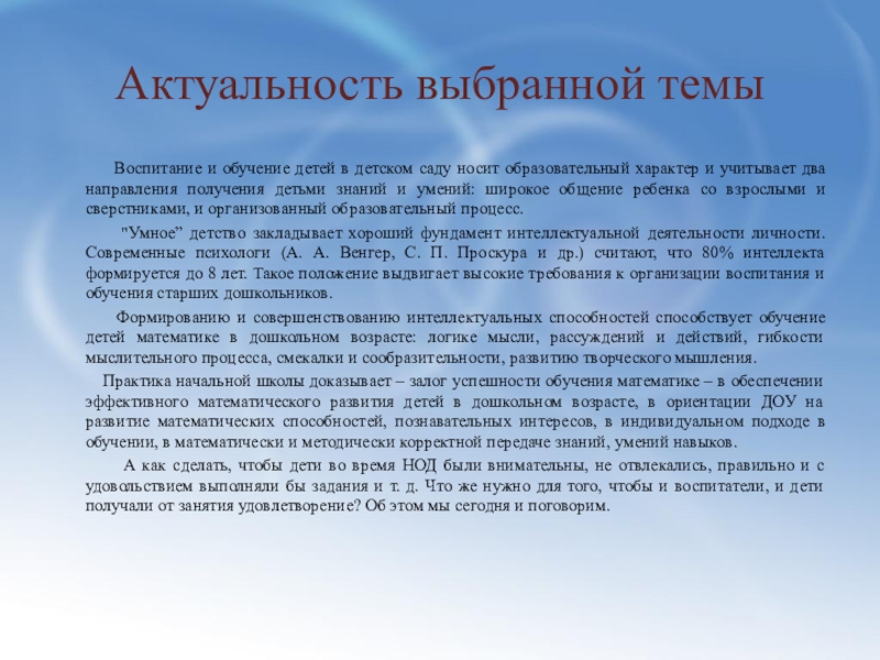 "Умное” детство закладывает хороший фундамент интеллектуальной деятельности личности. Современные психологи (А. А. Венгер, С. П. Проскура и др.) считают, что 80% интеллекта формируется до 8 лет. Такое положение выдвигает высокие требования к организации воспитания и обучения старших дошкольников.