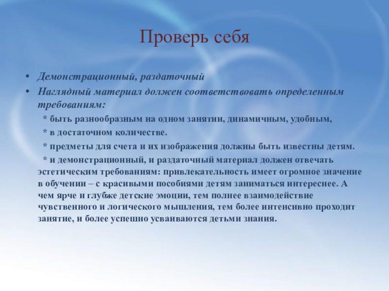 * и демонстрационный, и раздаточный материал должен отвечать эстетическим требованиям: привлекательность имеет огромное значение в обучении – с красивыми пособиями детям заниматься интереснее. А чем ярче и глубже детские эмоции, тем полнее взаимодействие чувственного и логического мышления, тем более интенсивно проходит занятие, и более успешно усваиваются детьми знания.