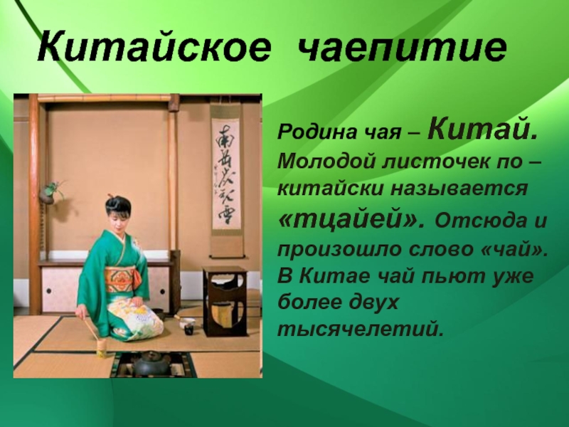 «тцайей». Отсюда и произошло слово «чай». В Китае чай пьют уже более двух тысячелетий.