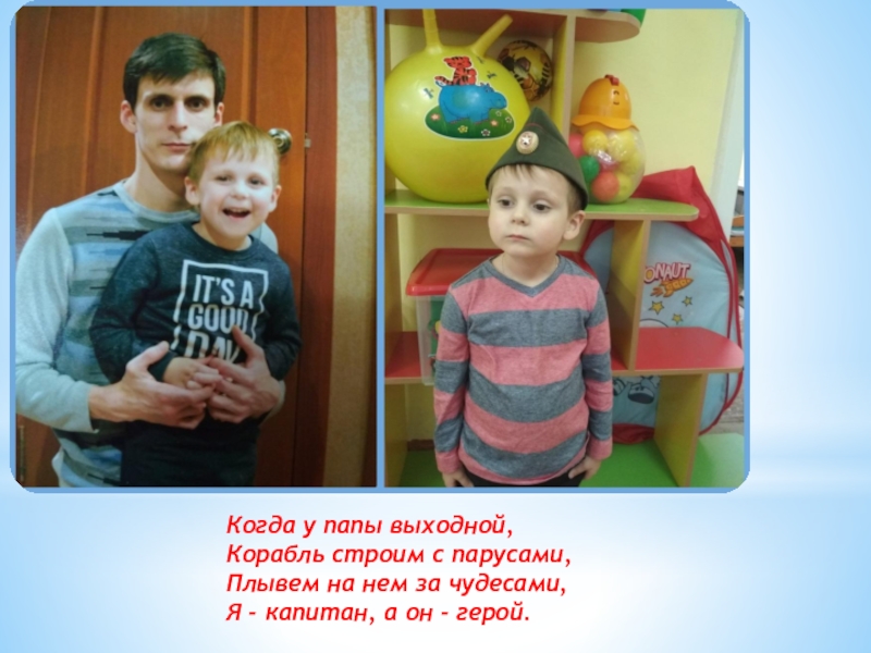 Когда у папы выходной,Корабль строим с парусами,Плывем на нем за чудесами,Я - капитан, а он - герой.