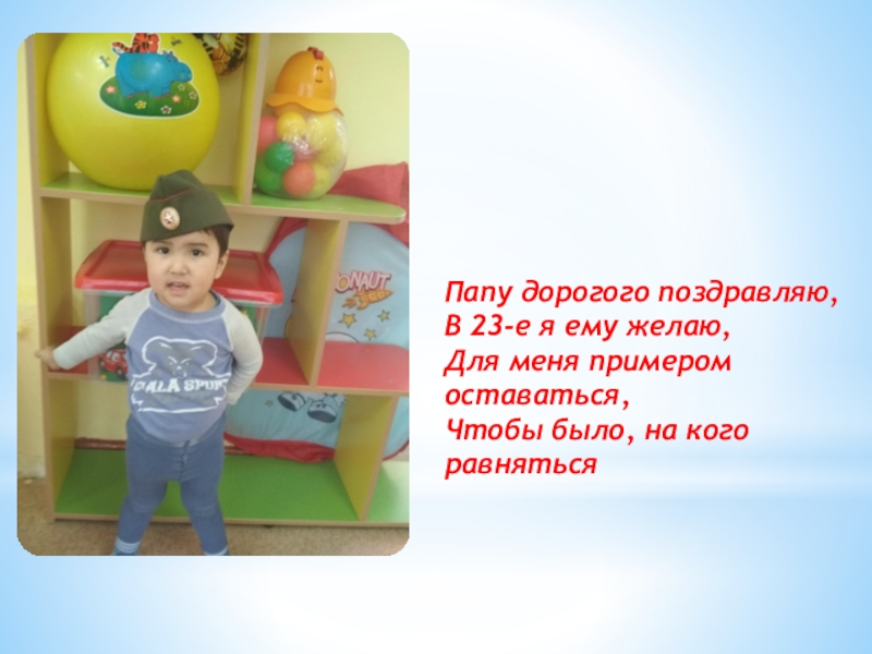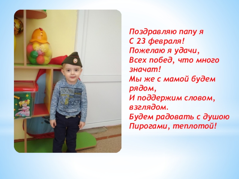 Поздравляю папу яС 23 февраля!Пожелаю я удачи,Всех побед, что много значат!Мы же с мамой будем рядом,И поддержим