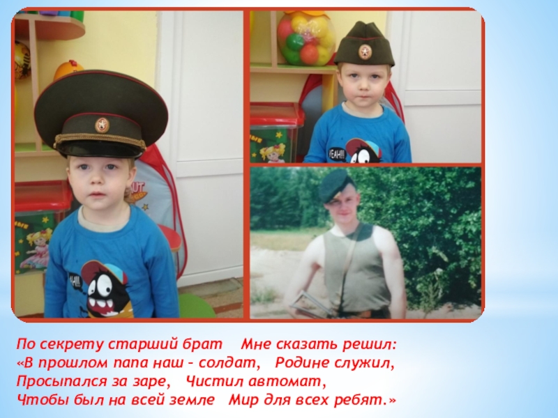 По секрету старший брат  Мне сказать решил: «В прошлом папа наш – солдат,  Родине служил,