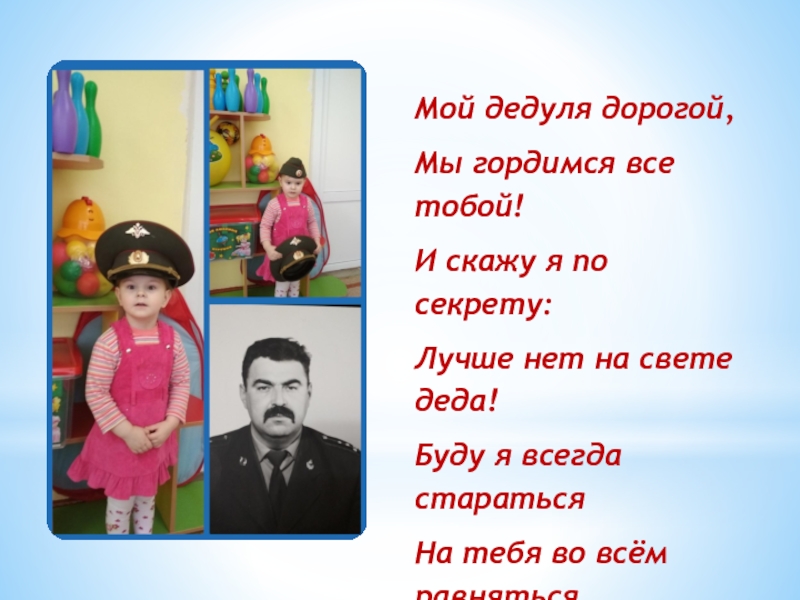 Мой дедуля дорогой,Мы гордимся все тобой!И скажу я по секрету:Лучше нет на свете деда!Буду я всегда старатьсяНа тебя во всём равняться.