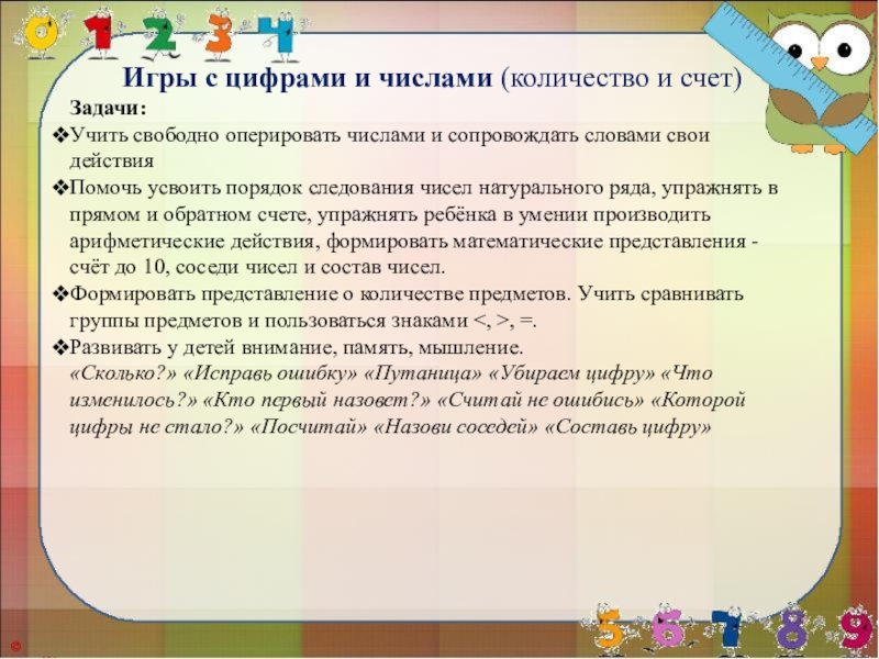 Слайд 8Игры с цифрами и числами (количество и счет)