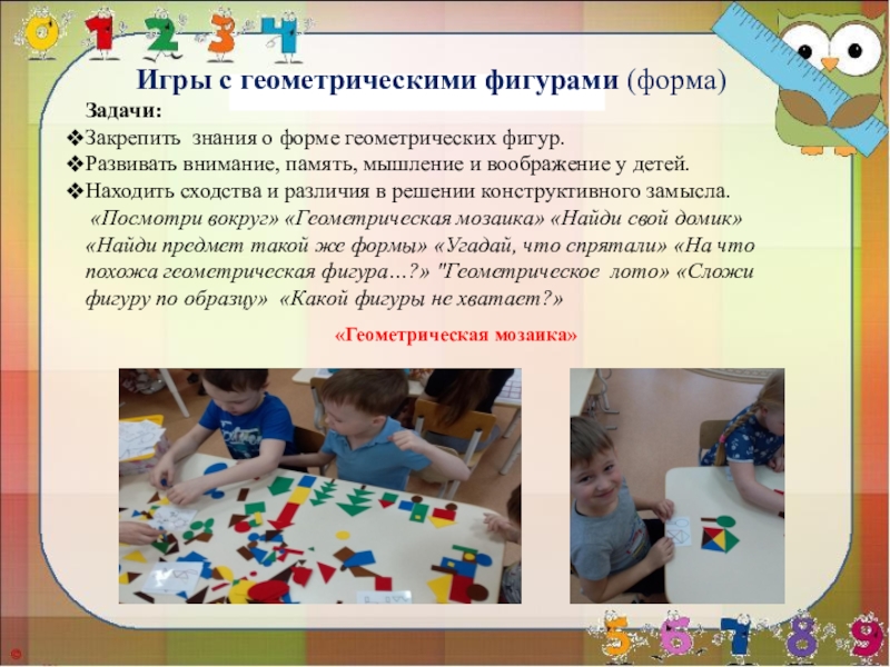 «Посмотри вокруг» «Геометрическая мозаика» «Найди свой домик» «Найди предмет такой же формы» «Угадай, что спрятали» «На что похожа геометрическая фигура…?» "Геометрическое лото» «Сложи фигуру по образцу» «Какой фигуры не хватает?»
