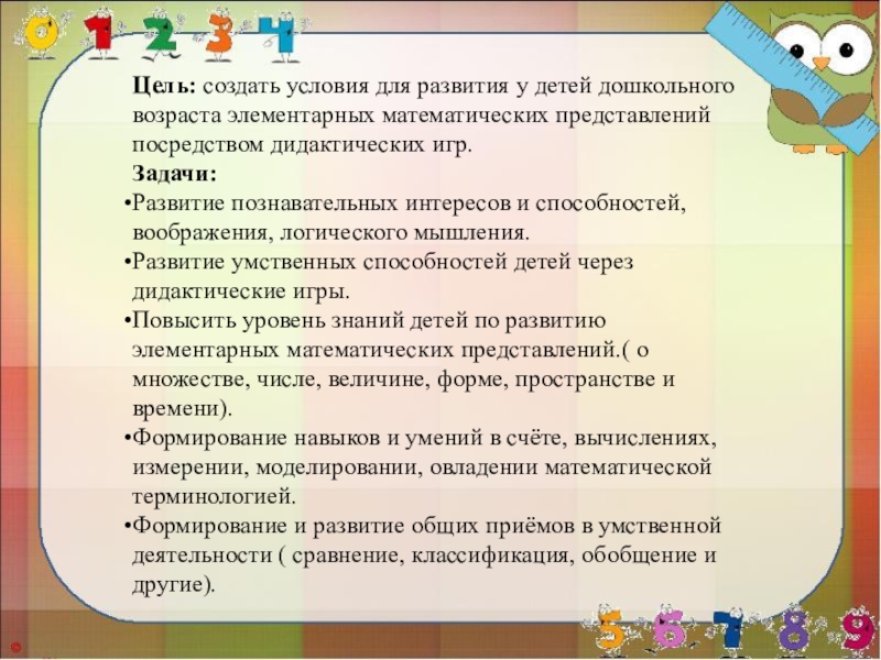 Слайд 4Цель: создать условия для развития у детей дошкольного возраста элементарных математических представлений