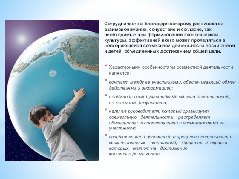 Сотрудничество, благодаря которому развиваются взаимопонимание, сочув­ствие и согласие, так необходимые при формировании экологической культуры, эффективней всего может проявляться в повторяющейся совмест­ной деятельности воспитателя и детей, объединенных достижением общей цели. Характерными особенностями совместной деятельности являются:контакт между ее участниками,