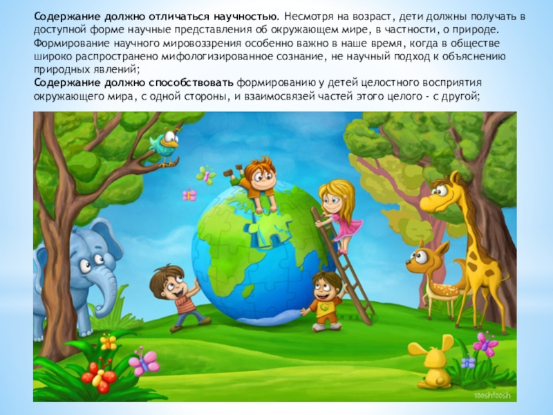 Слайд 4Содержание должно отличаться научностью. Несмотря на возраст, дети должны получать в