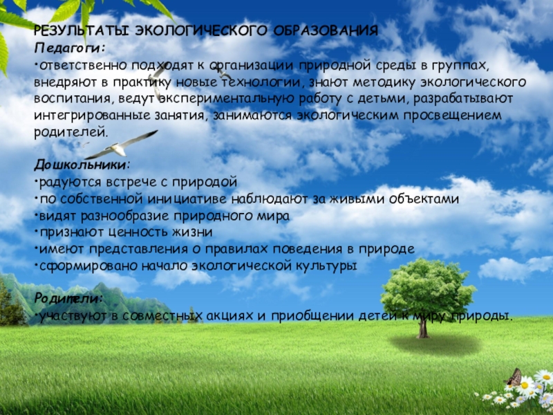 РЕЗУЛЬТАТЫ ЭКОЛОГИЧЕСКОГО ОБРАЗОВАНИЯ Педагоги: •ответственно подходят к организации природной среды в группах, внедряют в практику новые технологии,