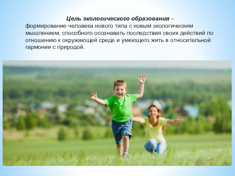 Цель экологического образования – формирование человека нового типа с новым экологическим мышлением, способного осознавать последствия своих действий