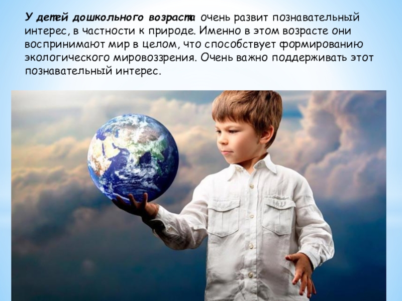 природе. Именно в этом возрасте они воспринимают мир в целом, что способствует формированию экологического мировоззрения. Очень важно поддерживать этот познавательный интерес.
