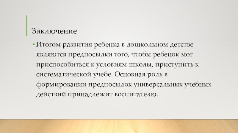 ЗаключениеИтогом развития ребенка в дошкольном детстве являются предпосылки того, чтобы ребенок мог приспособиться к условиям школы, приступить