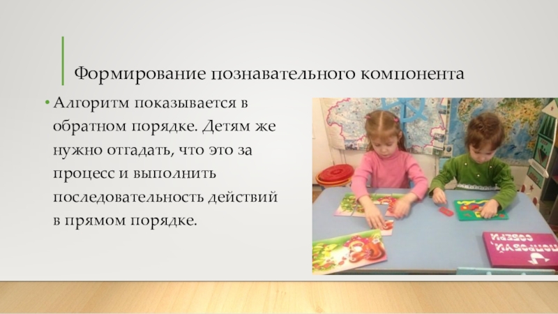 Формирование познавательного компонентаАлгоритм показывается в обратном порядке. Детям же нужно отгадать, что это за процесс и выполнить