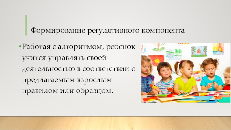 Формирование регулятивного компонентаРаботая с алгоритмом, ребенок учится управлять своей деятельностью в соответствии с предлагаемым взрослым правилом или
