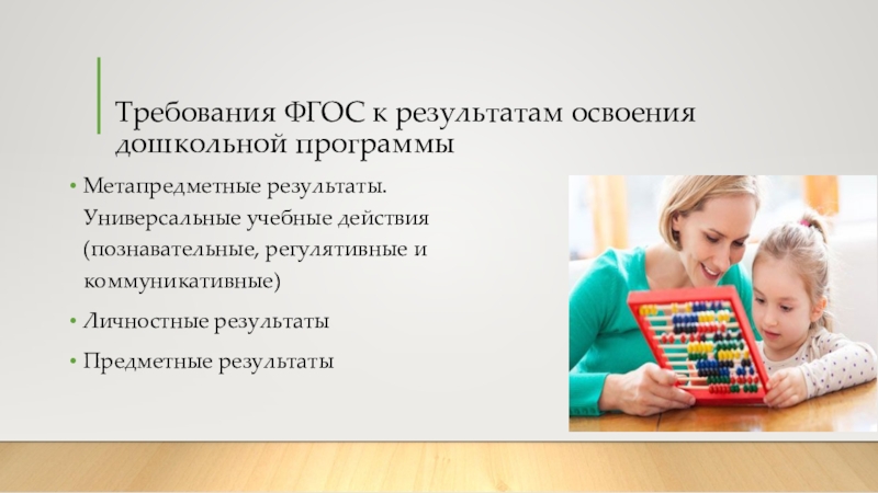 Требования ФГОС к результатам освоения дошкольной программыМетапредметные результаты. Универсальные учебные действия (познавательные, регулятивные и коммуникативные) Личностные результаты