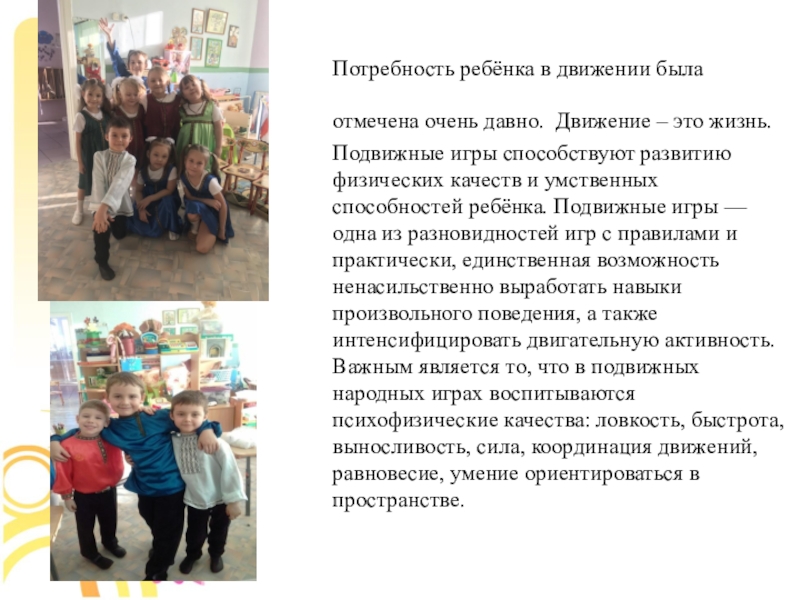 Потребность ребёнка в движении была отмечена очень давно. Движение – это жизнь. Подвижные игры способствуют развитию физических