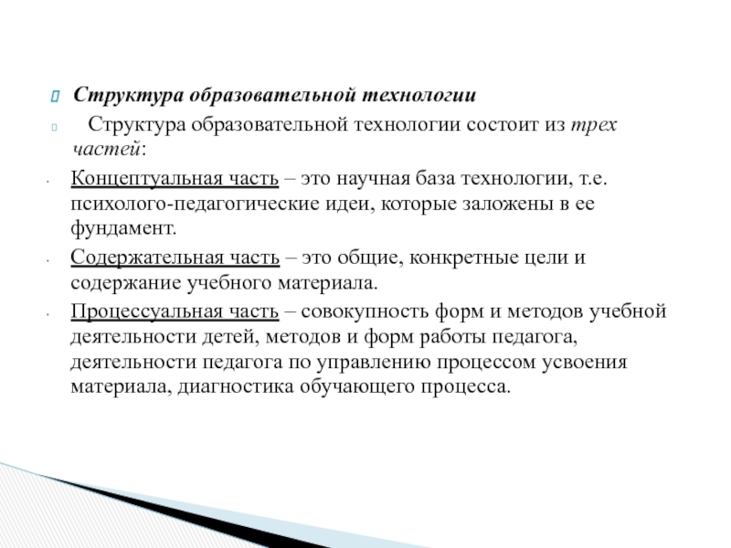 Процессуальная часть – совокупность форм и методов учебной деятельности детей, методов и форм работы педагога, деятельности педагога по управлению процессом усвоения материала, диагностика обучающего процесса.