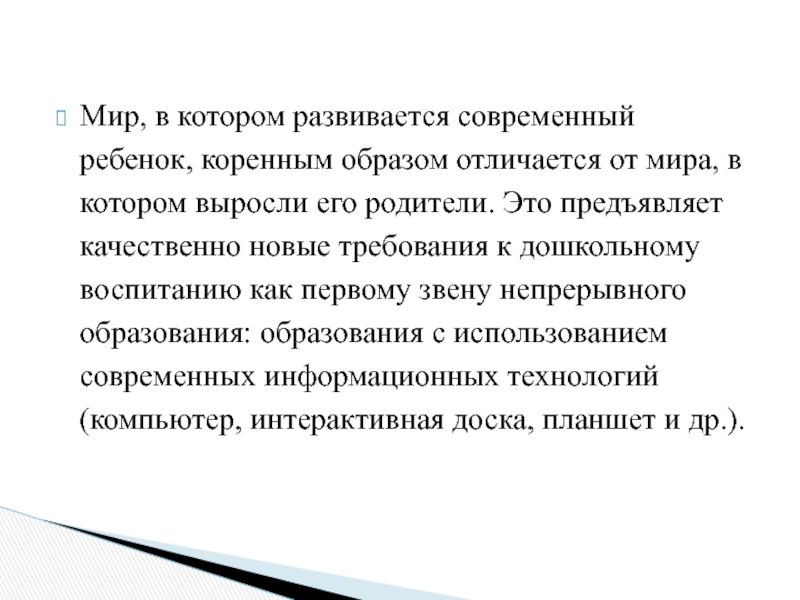 в котором выросли его родители. Это предъявляет качественно новые требования к дошкольному воспитанию как первому звену непрерывного образования: образования с использованием современных информационных технологий (компьютер, интерактивная доска, планшет и др.).