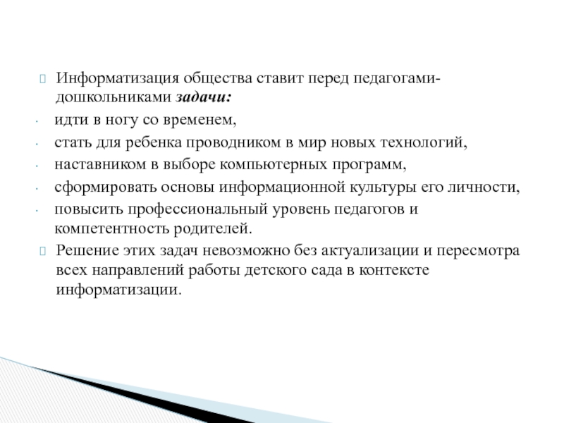 Слайд 9Информатизация общества ставит перед педагогами-дошкольниками задачи: