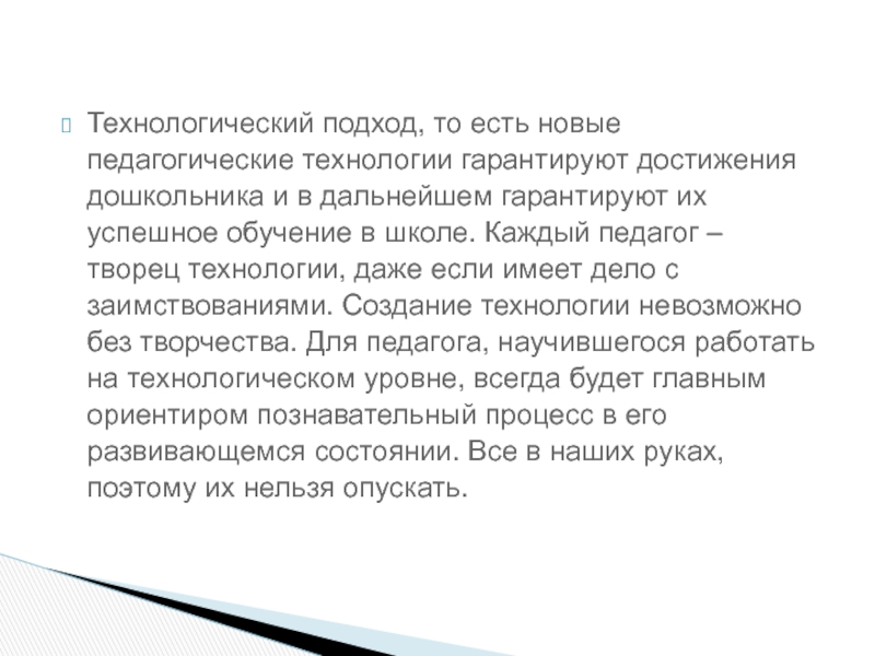 Слайд 10Технологический подход, то есть новые педагогические технологии гарантируют достижения дошкольника и