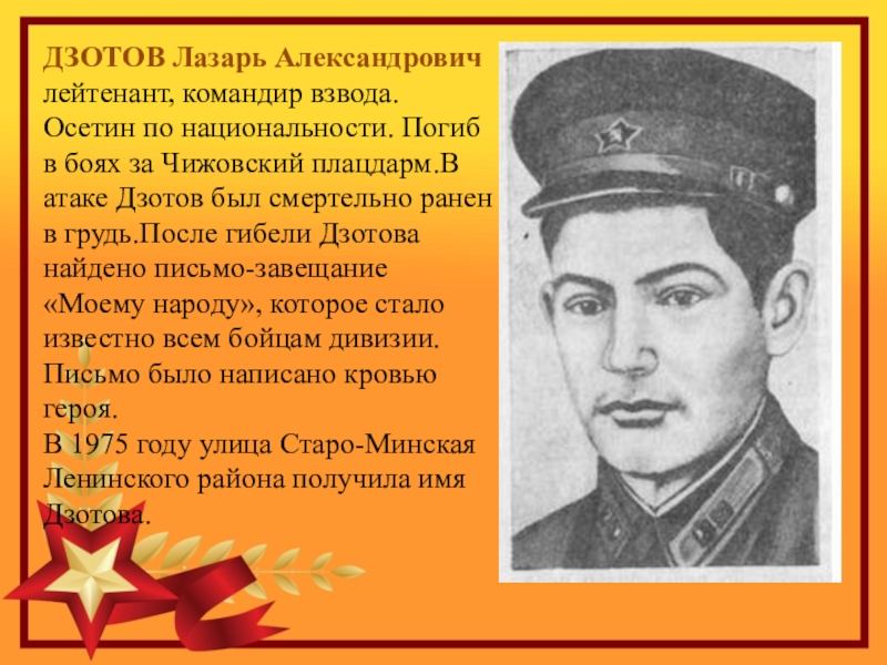 В 1975 году улица Старо-Минская Ленинского района получила имя Дзотова.