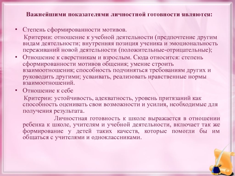 Слайд 5 Важнейшими показателями личностной готовности являются: