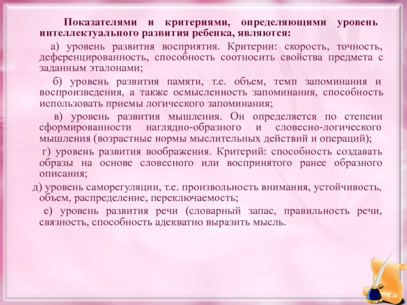 Слайд 7 Показателями и критериями, определяющими уровень интеллектуального развития ребенка, являются:
