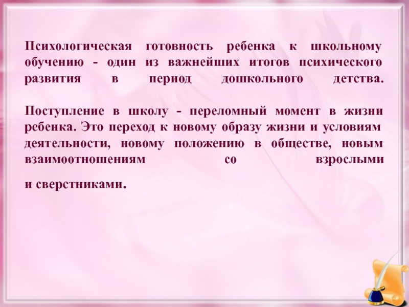 Поступление в школу - переломный момент в жизни ребенка. Это переход к новому образу жизни и условиям деятельности, новому положению в обществе, новым взаимоотношениям со взрослыми