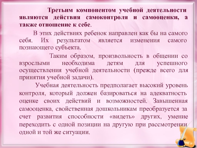 Учебная деятельность предполагает высокий уровень контроля, который должен базироваться на адекватность оценке своих действий и возможностей. Завышенная самооценка, свойственная дошкольникам преобразуется за счет развития способности «видеть» других, умение переходить с одной позиции на другую при рассмотрении одной и той же ситуации.