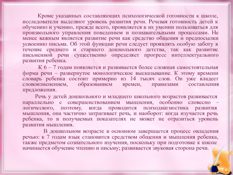 Кроме указанных составляющих психологической готовности к школе, исследователи выделяют уровень развития речи. Речевая готовность детей к обучению и учению, прежде всего, проявляется в их умении пользоваться для произвольного управления поведением и познавательными процессами. Не менее важным является развитие речи как средство общения и предпосылки усвоению письма. Об этой функции речи следует проявлять особую заботу в течение среднего и старшего дошкольного детства, так как развитие письменной речи существенно определяет прогресс интеллектуального развития ребенка.