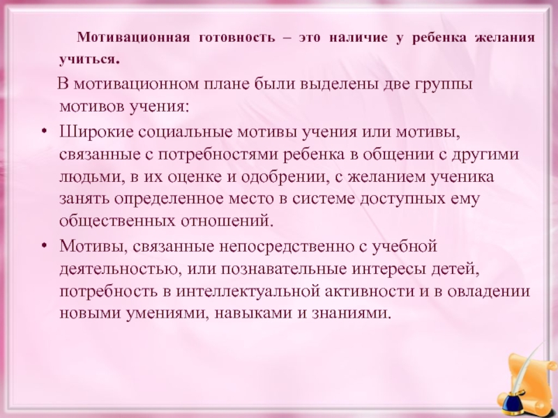 Слайд 4 Мотивационная готовность – это наличие у ребенка желания