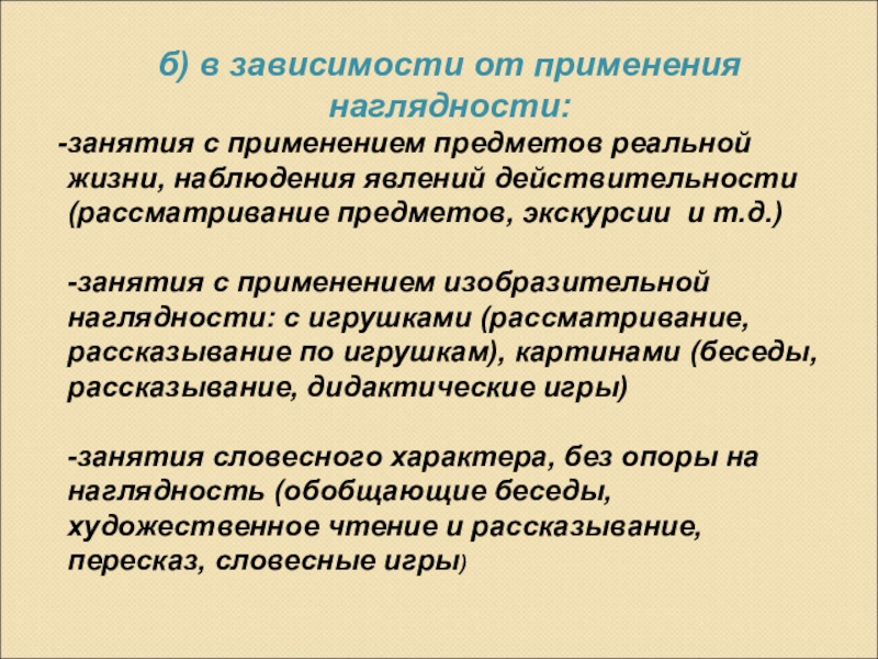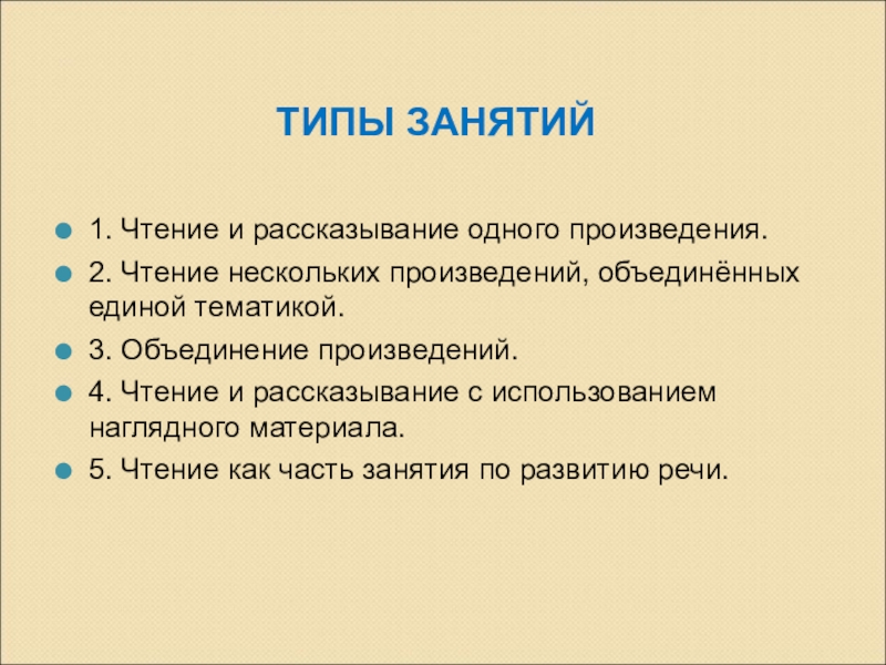 -занятия словесного характера, без опоры на наглядность (обобщающие беседы, художественное чтение и рассказывание, пересказ, словесные игры)