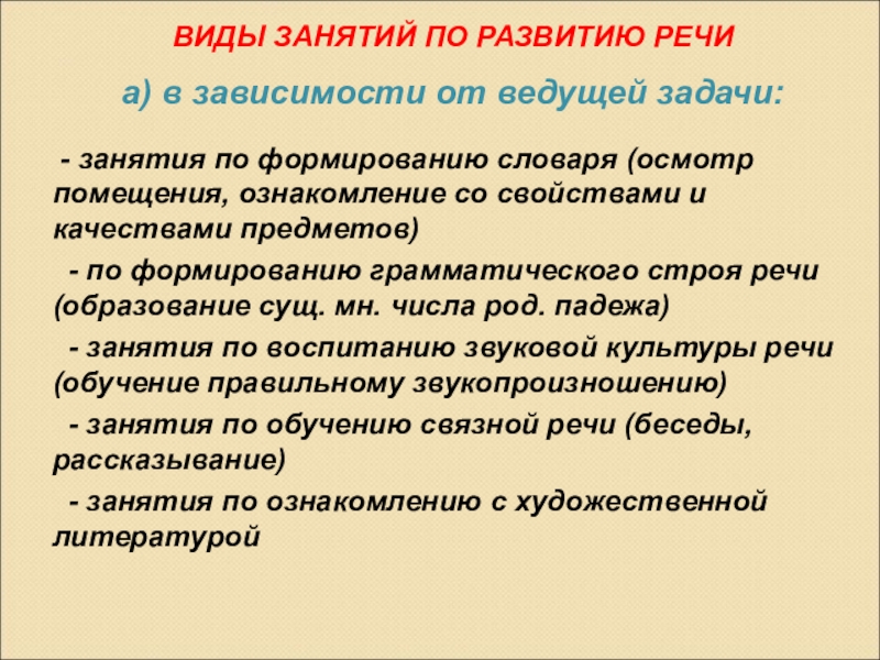 Слайд 8ВИДЫ ЗАНЯТИЙ ПО РАЗВИТИЮ РЕЧИ