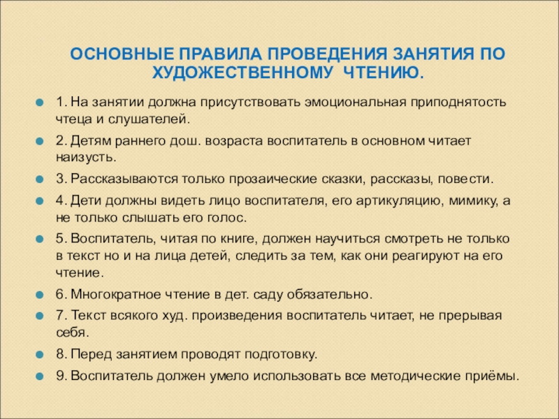 Слайд 22ОСНОВНЫЕ ПРАВИЛА ПРОВЕДЕНИЯ ЗАНЯТИЯ ПО ХУДОЖЕСТВЕННОМУ ЧТЕНИЮ.