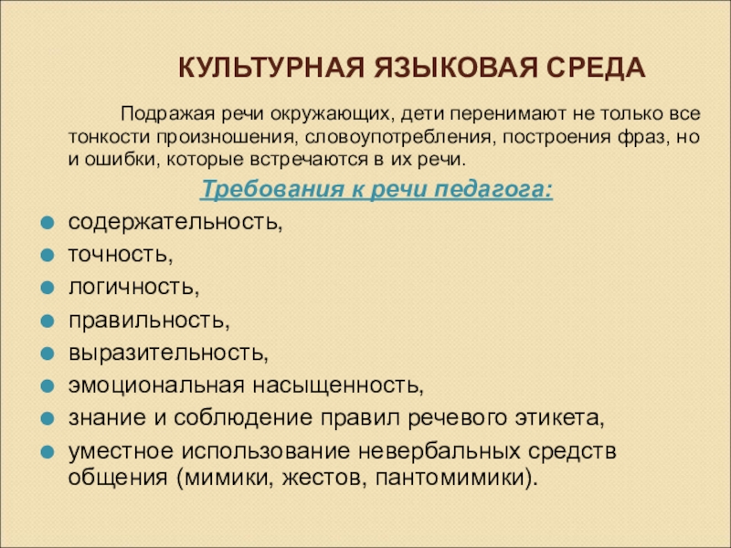 педагога, предназначенная для подражания детьми (должен быть доступным, четким, громким, произноситься неторопливо).