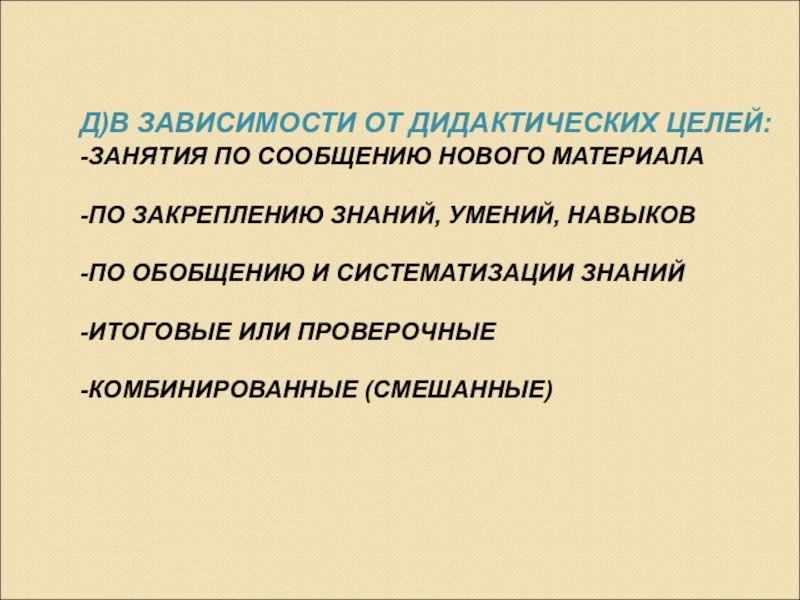 Д)В ЗАВИСИМОСТИ ОТ ДИДАКТИЧЕСКИХ ЦЕЛЕЙ: