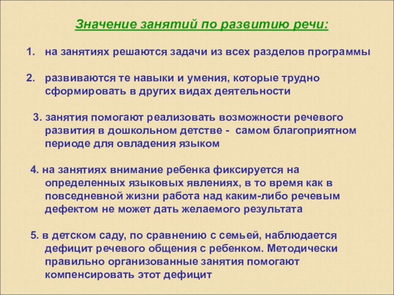 5. в детском саду, по сравнению с семьей, наблюдается дефицит речевого общения с ребенком. Методически правильно организованные занятия помогают компенсировать этот дефицит